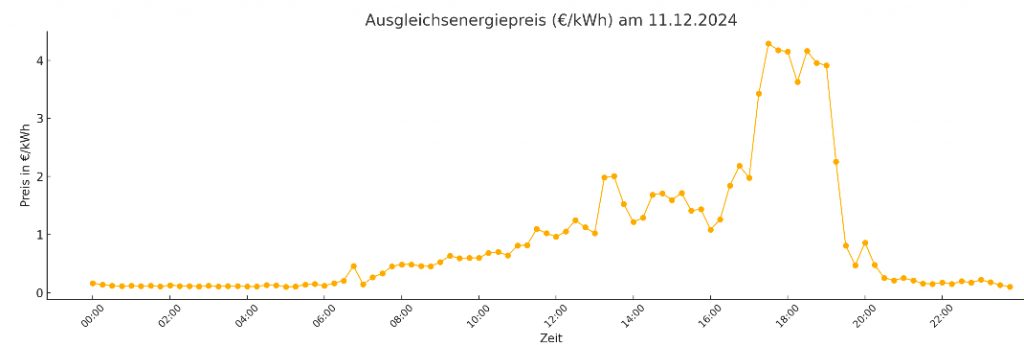 Ein Extrembeispiel war der 11. Dezember 2024, als die Strompreise am Spotmarkt auf knapp 4€/kWh stiegen (Ausgleichsenergiepreis (ID AEP) 15 Minuten (DE-LU)). An diesem Tag hätte ein Speicher von 10 kWh durch die Einspeisung Einnahmen von 8,10 € erzielen können. Zusammen mit den regelmäßigen Erträgen aus der Regelenergie und Lastverschiebung summieren sich die Vorteile eines Batteriespeichers auf etwa 1.000 € pro Jahr, abhängig von der Marktvolatilität und dem Nutzungsverhalten.