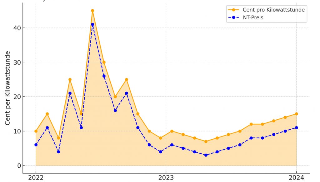 Entwicklung der Epex Day Ahead Preise 20,22 bis Ende 2024 in gelb sind die monatlichen Durchschnittswerte angegeben, in blau, die durchschnittlichniedrigsten Werte, die erreicht wurden. wird der Verbrauch in als NT Fenster gelegt sind Einsparungen von 15 % möglich.