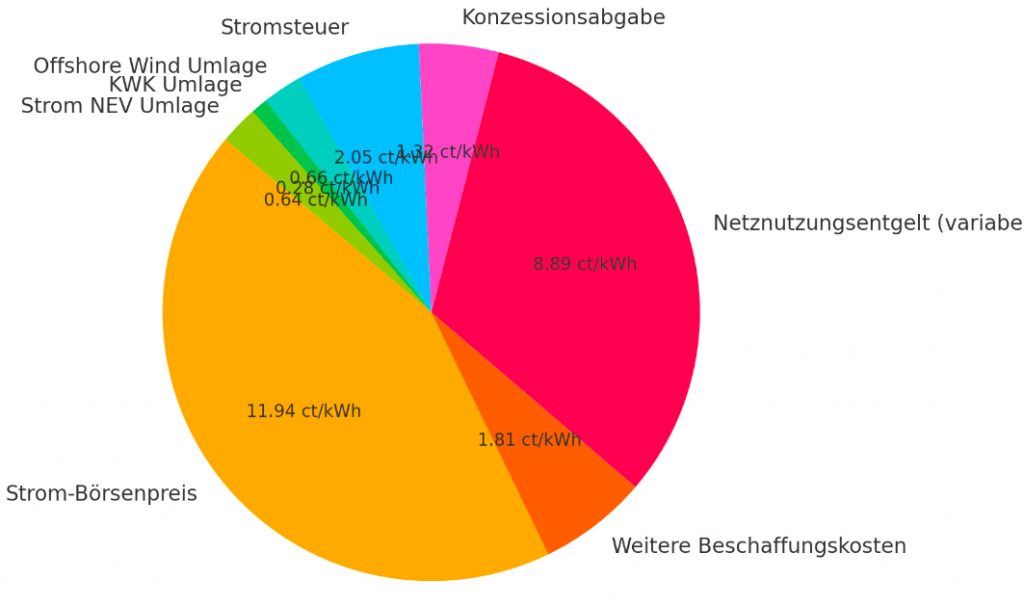 Insgesamt summieren sich diese Komponenten zu einem Preis von etwa 27,59 ct/kWh (basierend auf auf dem Netzgebiet der LVM im Schwaben und dem durchschnittlichen Strom Börsenpreisen von Oktober 2024). Ein großer Teil der Kosten entfällt also auf Steuern und Abgaben sowie den Netzbetrieb, während der eigentliche Strompreis nur einen Bruchteil ausmacht.